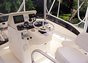 This unusual helm design works well except for the engine controls that are poorly placed.