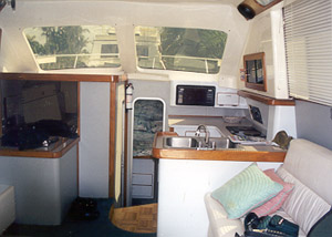 Interior fit and finish is sort of ho-hum. Here you'll find a few carry-overs from the bad old days. Like a mica laminated cabin bulkhead with a big ugly seam right down the middle. And fabric covered trim pieces to cover up the lack of good parts fitting. And fabric glued on the hull sides in the forward cabin that is now falling off, leaving quite a mess. It's closer to early motor home than Architectural Digest. But that's what you're not paying for in trade for the much lower price. A $5,000 remodeling job could do wonders here. As you can see from the photo below, the use of teak as trim is not well thought out, design wise. It accents too many angles, making the interior look cluttered.