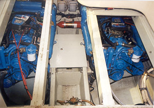 We also got the distinct impression that this boat was designed for diesel power as she is notably tender with gas engines, though we've found only a rare few with 3116's or Yanmars, the later of which is mostly aluminum and therefore would do little in the way of adding ballast. And at 300 hp, that kind of power won't give you the speeds most would like, despite the higher torque. A little bit of trim tab input throws her wildly over to one side, making her hard to control. We immediately noticed that the hull floats very high in the water with the chines nearly exposed. These points give us the idea that this boat probably performs a lot better with higher torque diesels, except that no larger diesels such as the 3208 will fit. The best you will find are the troublesome 3116's, but these just don't turn out enough horses. We'd like to see at least 375 Hp diesels in her. At 19,000 lbs. she's pushing the envelope for gas power. Our boat had only 377 hours on the meters and we did not know the engine history. They may have been rebuilt once.